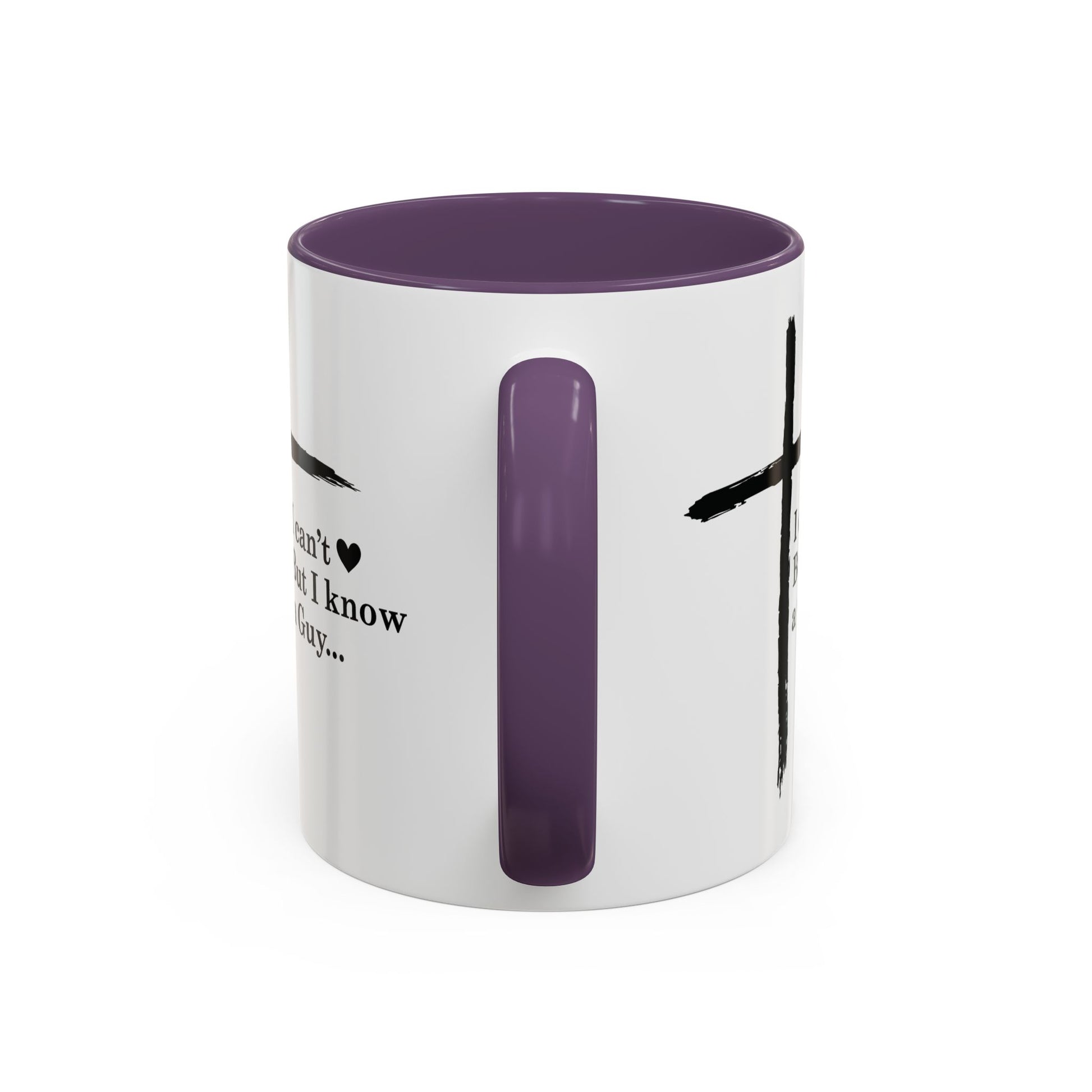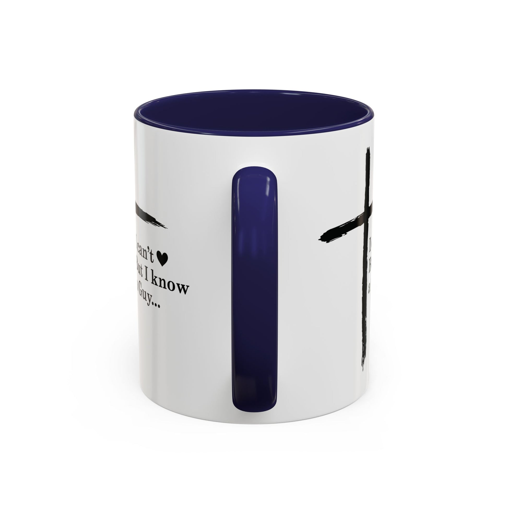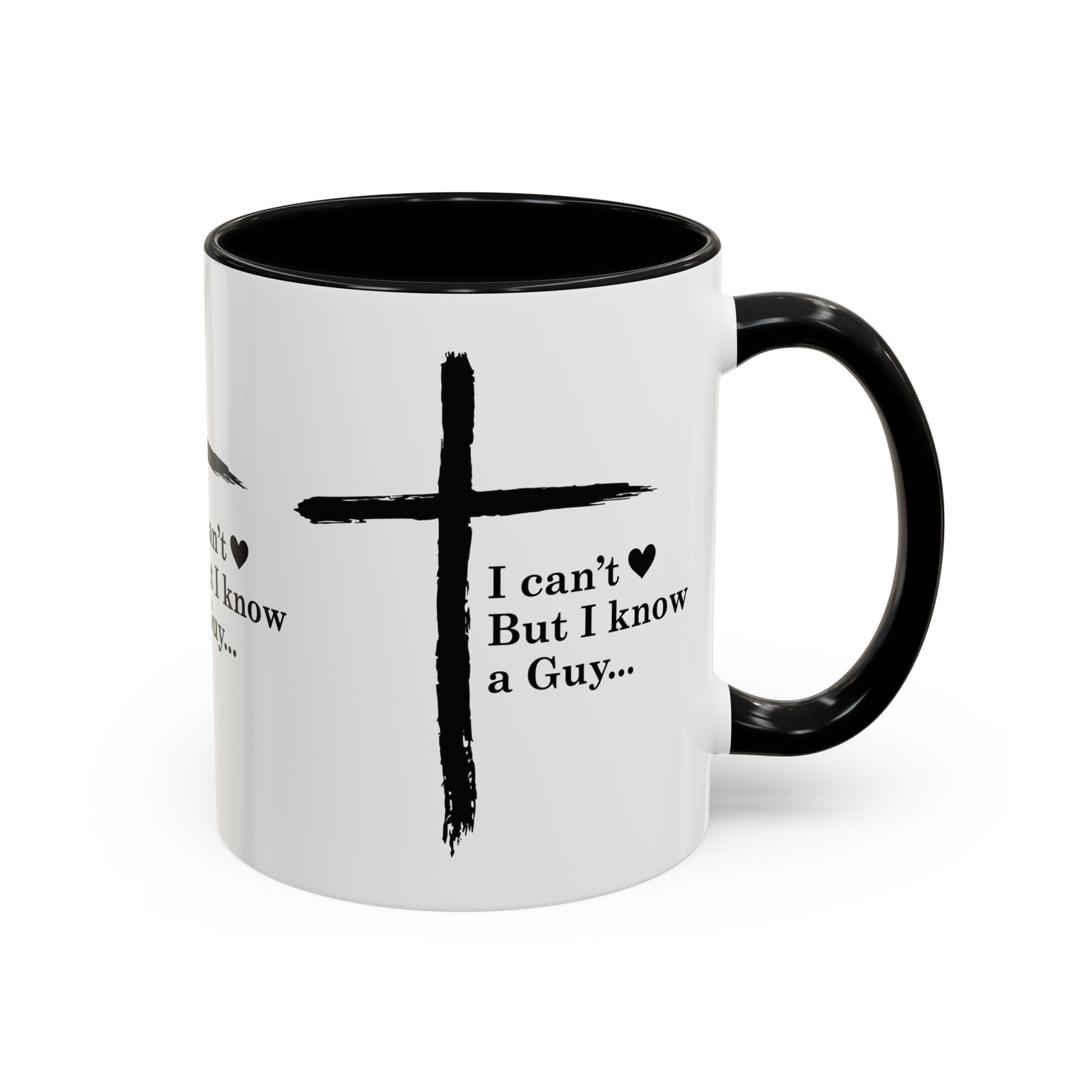 A warm, faith-forward mug that brings a quiet reminder into everyday routines. The white ceramic body with a contrasting black interior and handle frames a simple hand-brushed cross and the phrase “I can’t ♥ But I know a Guy...” —a gentle, playful nod to trusting Jesus when life feels too big. It feels like a pause in a busy morning: warm hands around glossy ceramic, a soft smile at the message, and a steadying breath. Use it for slow coffee on the porch, to hold tea during evening devotions, or as a thoughtful token to share with a friend in need of encouragement.