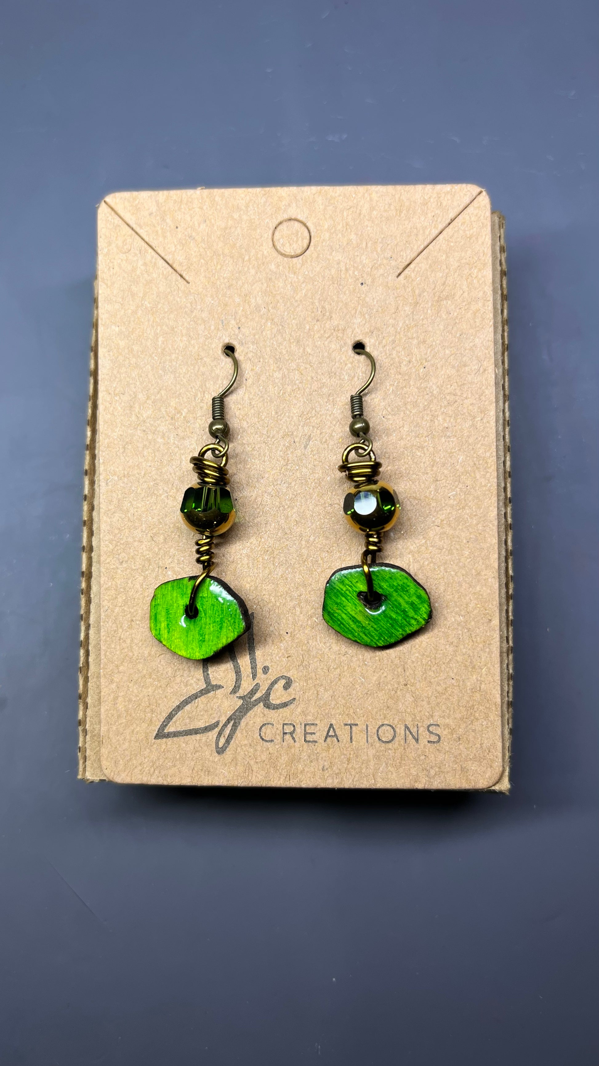 These funky dangle earrings feature colorful wood shapes and glass faceted beads, hung from fish hook ear wires. Each piece is hand painted for a unique and artistic touch. Elevate any outfit with these eye-catching accessories.